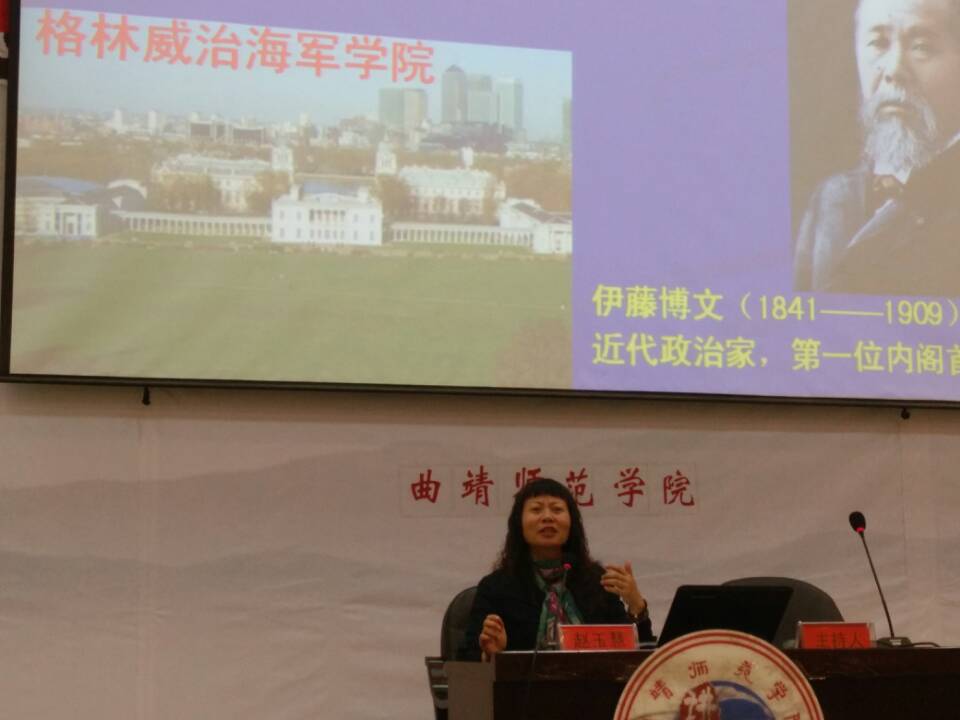 11月5日晚上在曲靖师院图书馆一楼报告厅,中学历史特级教师、昆明市历史学科带头人、昆明市第三中学历史教研组组长赵玉慧老师应邀为参加“国陪计划(2014)”短期集中紧缺薄弱学科初中历史培训研修班的学员和曲靖师院在校本科生作了题为《严复在中国近代史上地位解读》的精彩讲座。